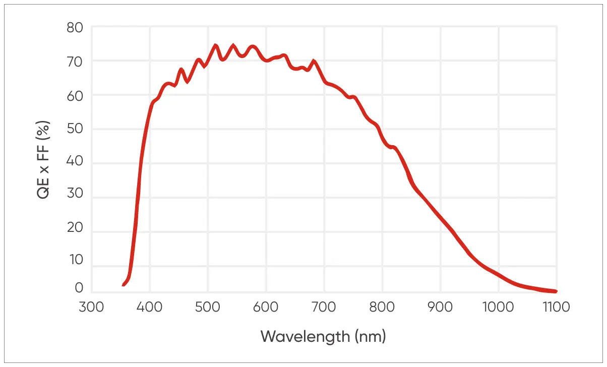 - Peak QE: 75% @540 nm; 33% @850 nm